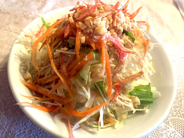 キャベツ、人参の千切りに桜海老、ナッツトッピングされています。