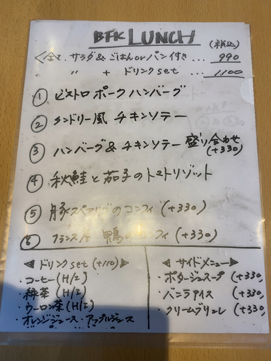 ランチは990円~、ドリンク付きで1,100円。サラダが付いています。