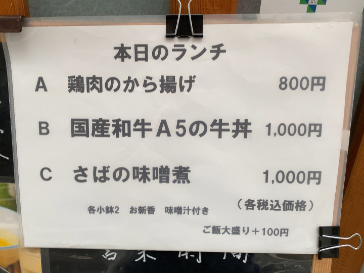 どれも小鉢が2つ、お新香とお味噌汁付きです。