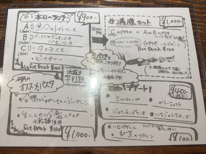 他にも今月のオススメパスタ1,000円が2種と、満腹セット(C+A or Bのハーフサイズ+サラダ+一口デザート)1,200円などもありました。
