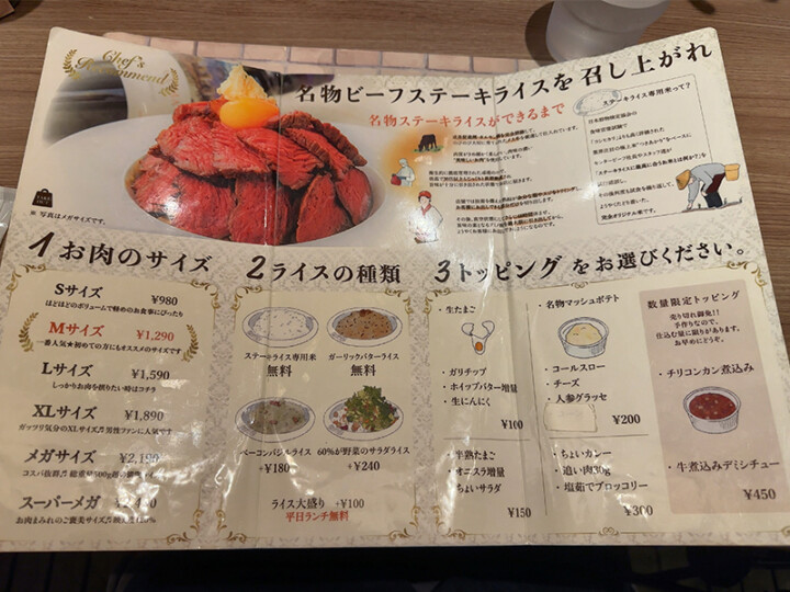 ステーキライスのライスは4種あり、独自開発されたステーキライス専用米が使用されています。